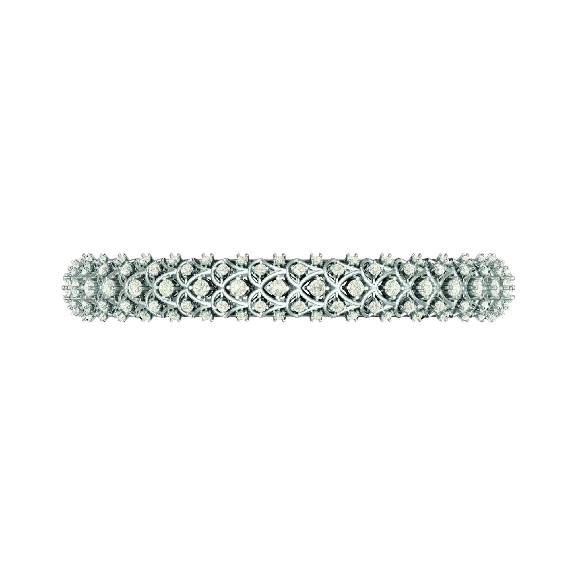 Redefine opulence with the Filigree Eternity Gold Bracelet, a masterpiece of craftsmanship from the Tribhanga atelier. This rigid bangle captures the essence of royal heritage, featuring a breathtaking filigree lattice pattern along the side gallery that adds depth and vintage character. Cast in lustrous 18k white gold, the face of the bangle is paved with a continuous, unbroken circle of precision-set diamonds. Heavy, luxurious, and deeply detailed, this piece is designed for the woman who appreciates art from every angle.