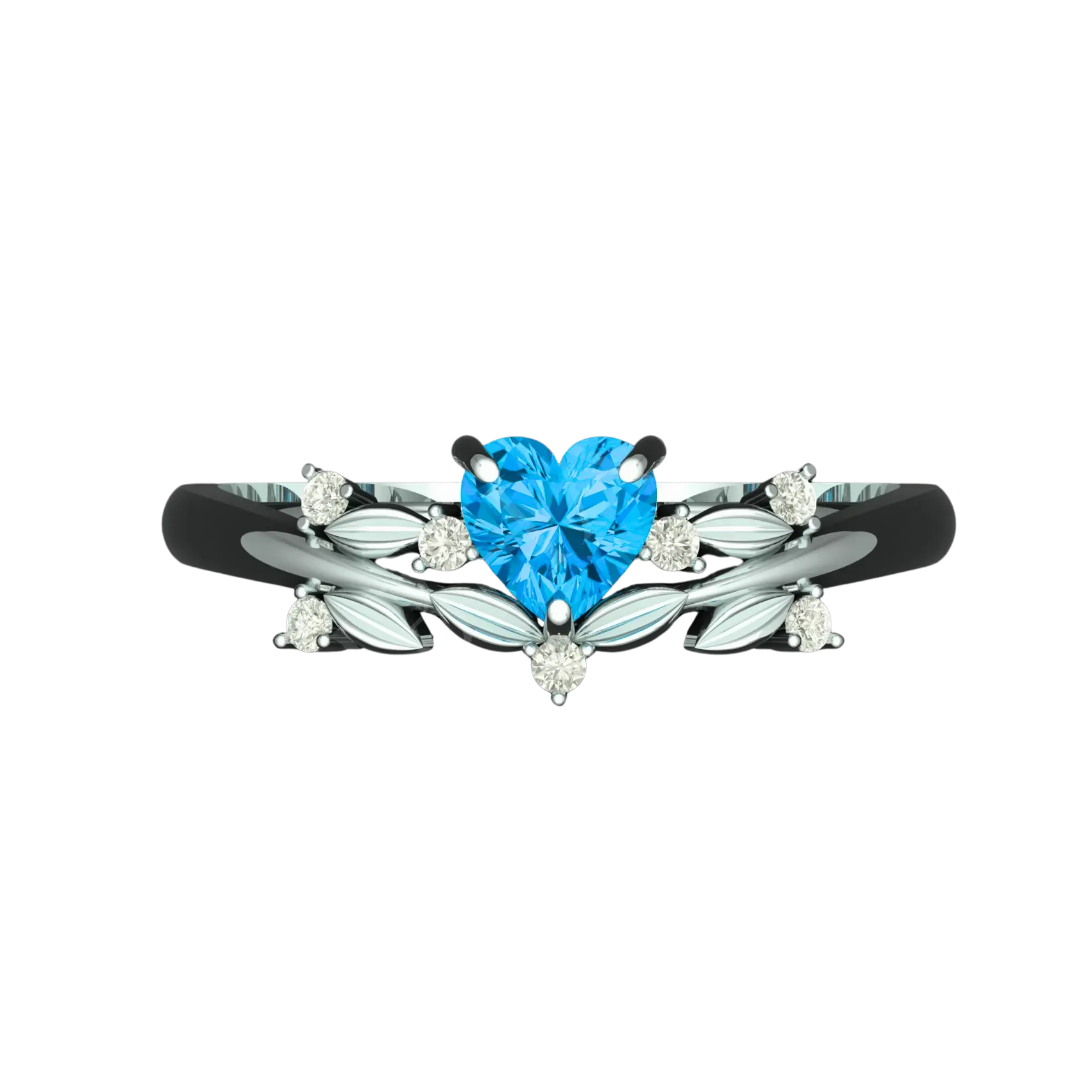 Express your love with this whimsical Tribhanga blue heart ring. The focal point is a vibrant, heart-shaped blue topaz stone, symbolizing deep affection and loyalty. The band is artfully designed with delicate leaf motifs on either side, creating a floral embrace around the center stone. Small, sparkling round stones are nestled among the leaves, adding a hint of dew-drop brilliance to the nature-inspired setting. Crafted with precision, this blue heart ring is a romantic and charming accessory, perfect as a promise ring, birthday gift, or a sweet token of appreciation.