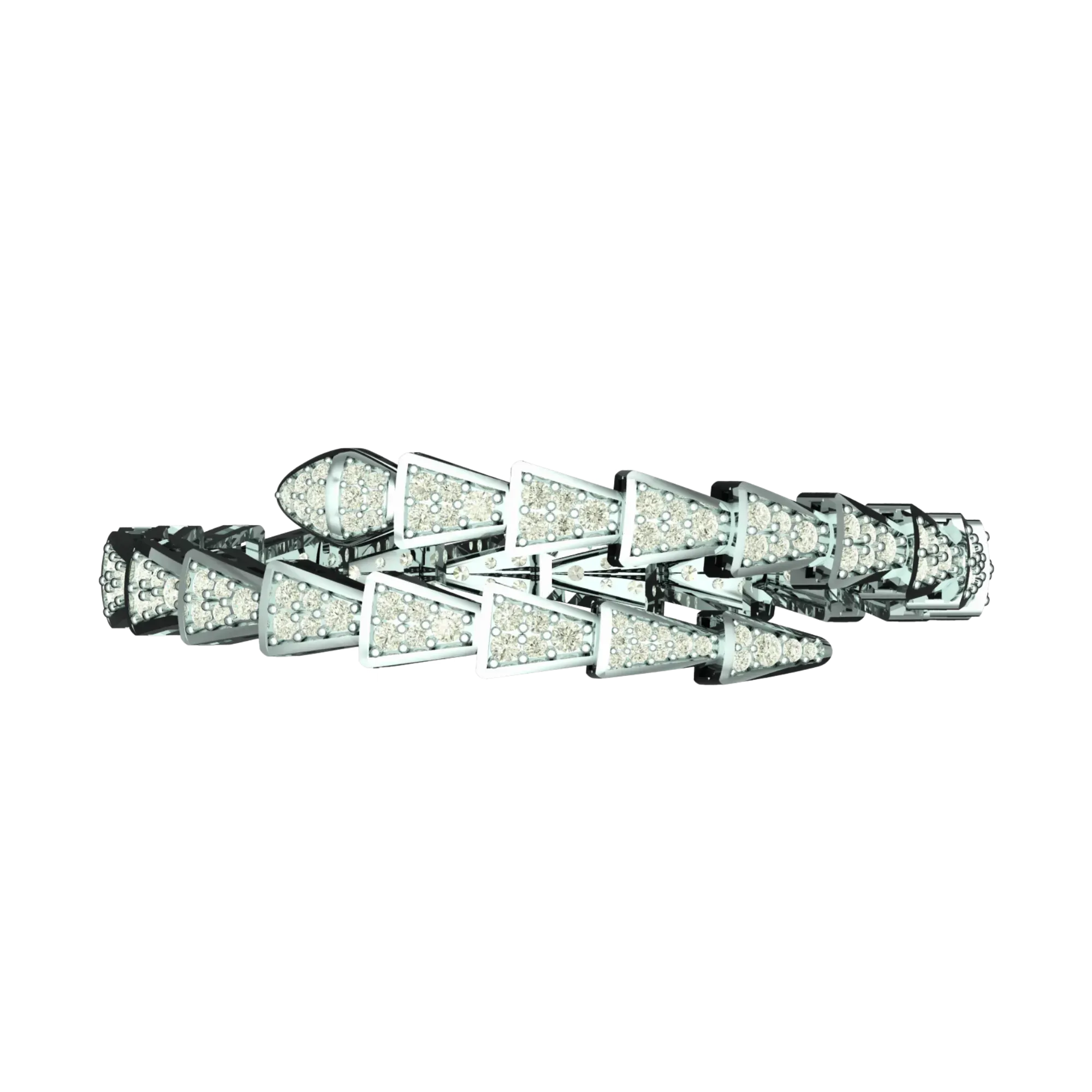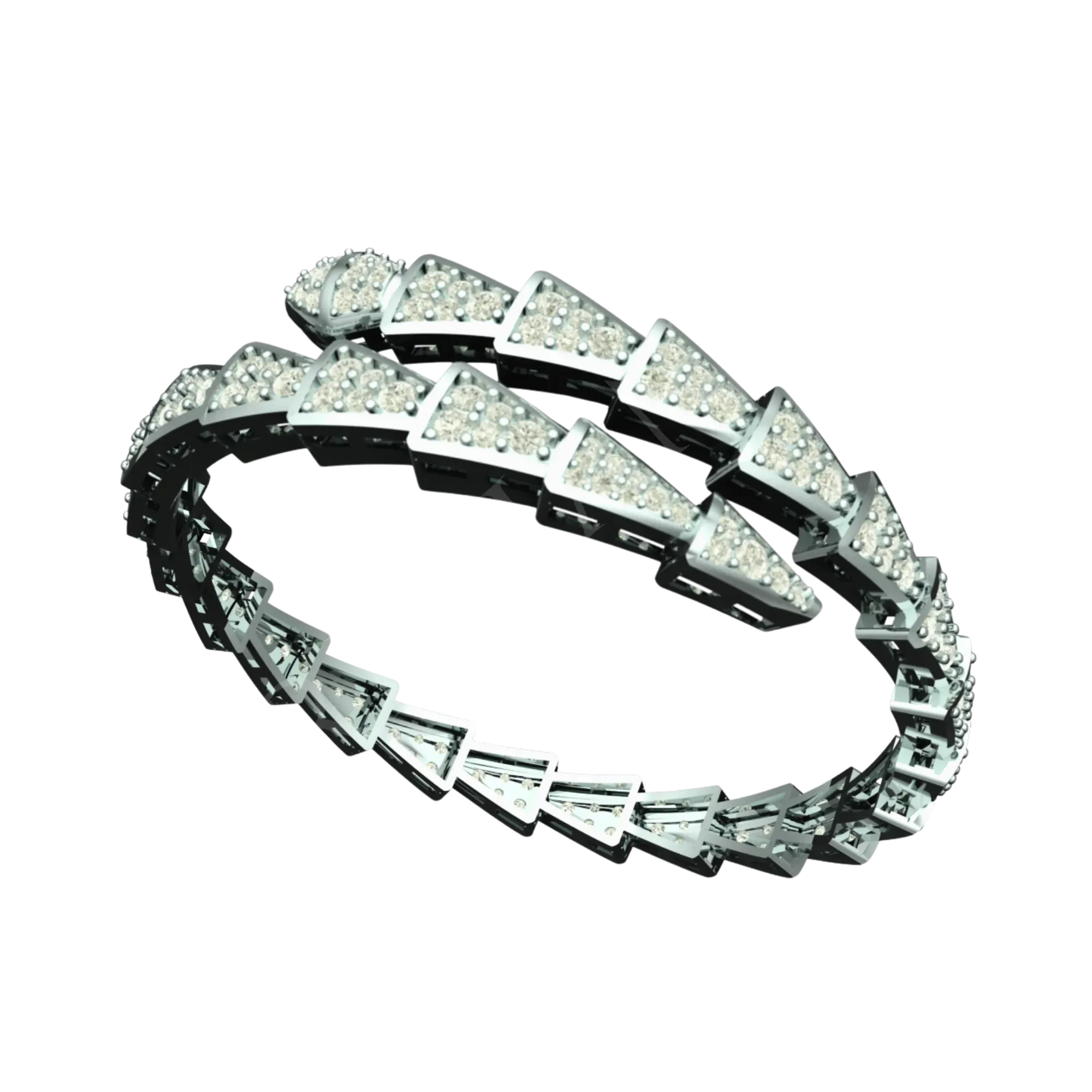 Redefine your jewelry collection with the Geometric White Gold Bracelet, a standout piece from the Art of Structure line at Tribhanga. Breaking away from traditional curves, this avant-garde accessory features a dynamic spiral composed of interlocking triangular segments. Crafted in lustrous 18k white gold, each geometric link is micro-paved with brilliant diamonds that catch the light from every angle. The innovative flexible wrap design ensures a comfortable, clasp-free fit, making it the ultimate statement of modern luxury.