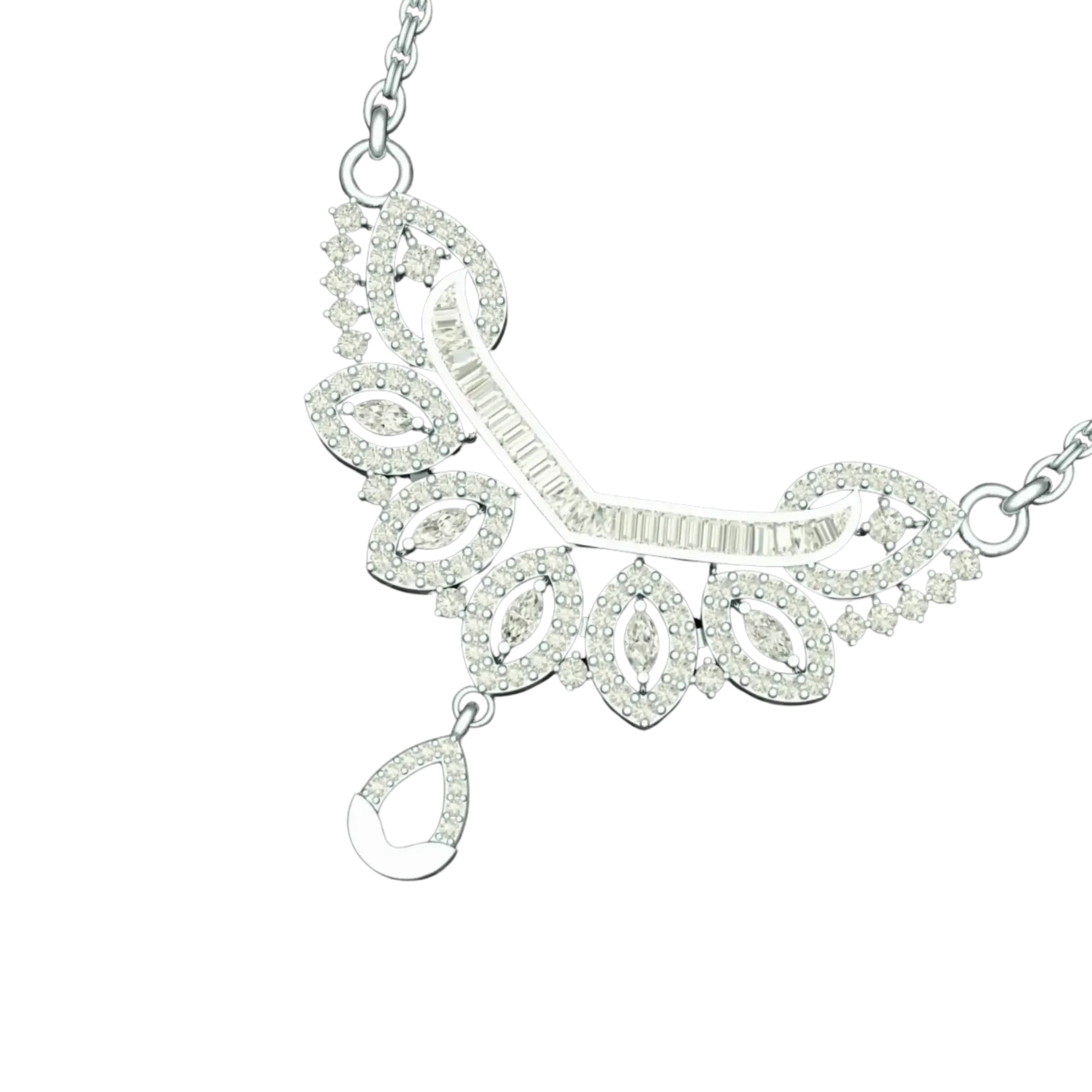 Experience the allure of this Tribhanga diamond pendant necklace. This sophisticated piece is defined by a striking V-shaped bar set with baguette-cut stones that anchors a cascade of floral-inspired elements. Each petal-like shape is meticulously outlined with pave-set diamonds and centers around a brilliant marquise-cut stone, creating a captivating play of light and geometry. The design culminates in a delicate pear-shaped drop that adds graceful movement. Crafted by Tribhanga artisans, this diamond pendant necklace is a masterpiece of modern design and classic sparkle, perfect for elevating evening wear or celebrating life’s most precious moments.