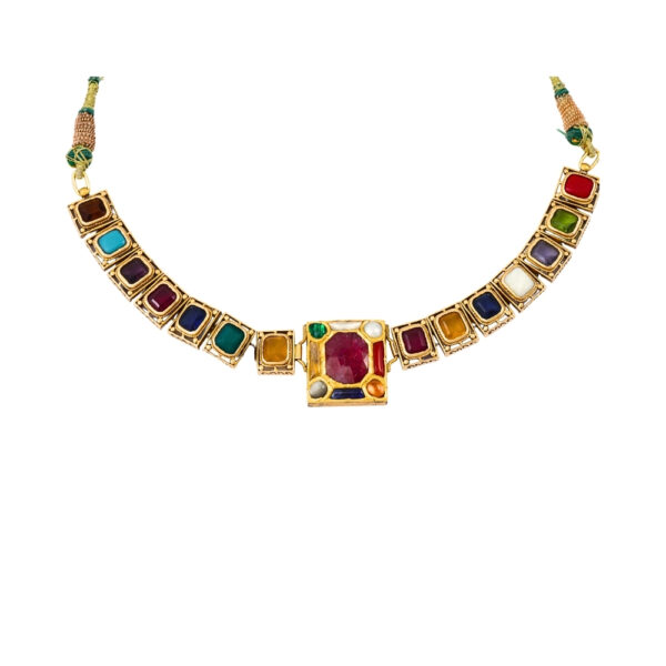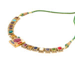 Celebrate the brilliance of tradition with Tribhanga’s Navratan Necklace, an exquisite masterpiece crafted with nine powerful gemstones – ruby, pearl, red coral, emerald, yellow sapphire, diamond, blue sapphire, hessonite, and cat’s eye. Each gem carries deep cultural and astrological significance, symbolizing balance, prosperity, and protection. Meticulously designed, this necklace blends vibrant colors with refined artistry, making it a true heirloom piece. Whether worn with regal ethnic attire or as a statement accessory for special occasions, the Navratan Necklace reflects grace, luxury, and timeless heritage.