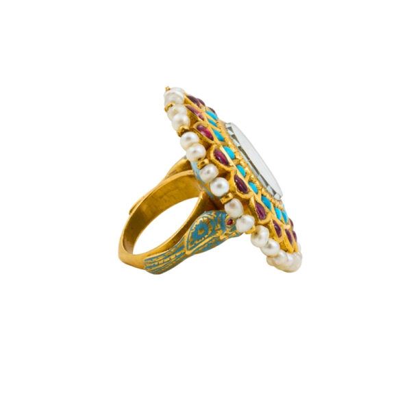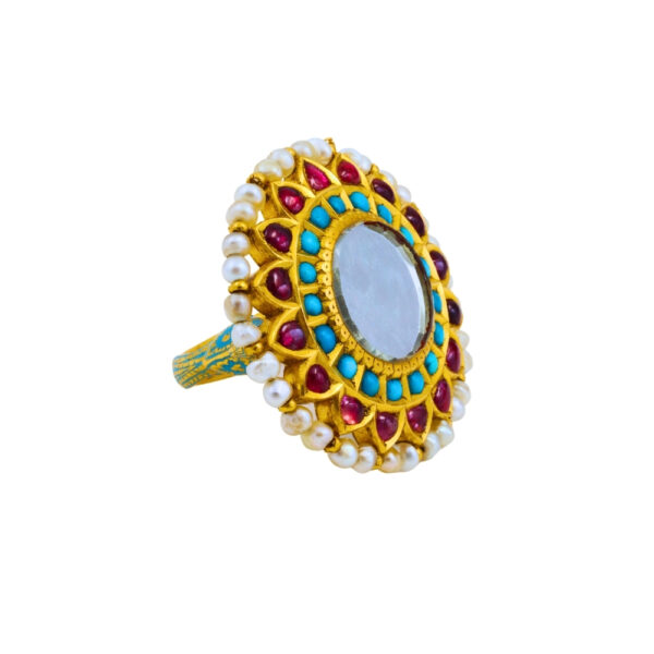 Add a touch of vibrance and heritage charm with Tribhanga’s Coloured Stone & Mirror Work Gold Ring. Handcrafted with precision, this ring combines colourful gemstones with intricate mirror detailing set in radiant gold. Lightweight and versatile, it is perfect for festive occasions, weddings, or adding a statement to contemporary outfits. Each piece showcases meticulous craftsmanship, blending traditional artistry with modern elegance, making it a timeless accessory that reflects sophistication, colour, and cultural heritage.